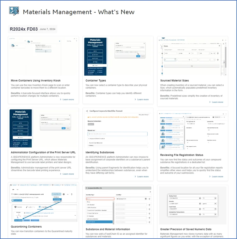 Materials Management and other BIOVIA apps exist as convenient, modern web apps on the 3DEXPERIENCE platform. Interoperable and frequently updated they exploit the latest approaches and best practices available in the world of user assistance to help make usage as easy as possible.