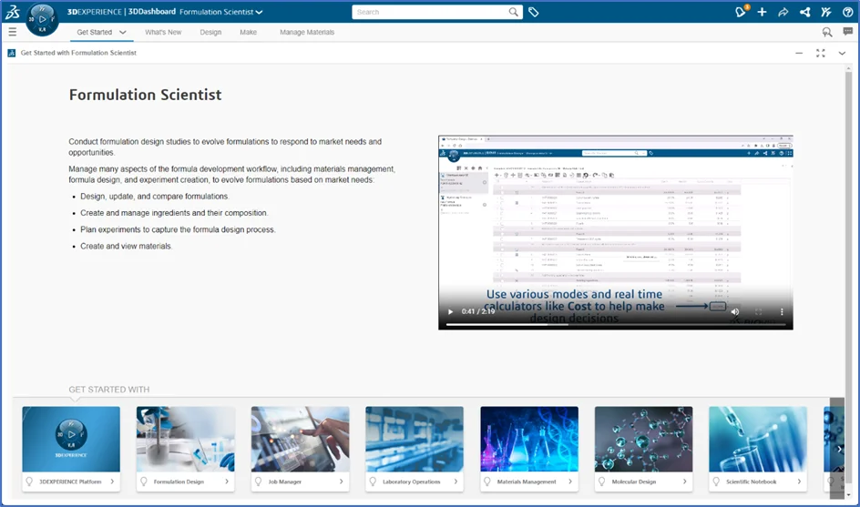 For the Formulation Scientist role, dedicated Design, Make, and Manage Materials tabs offer dashboard based, quick access to the key apps required to enable scientists to rapidly become productive with formulation development capabilities.