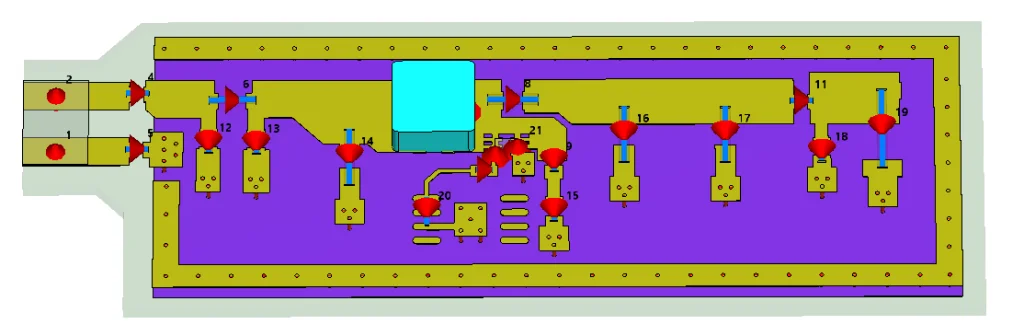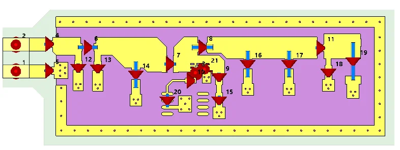 The first step for co-simulation is to import the 3D model of the PCB into CST MWS. The component connections are modeled using discrete ports. Each of the discrete ports is excited and the S-parameter results are available after the 3D simulation. Figure 1 shows the PCB model and the discrete ports.