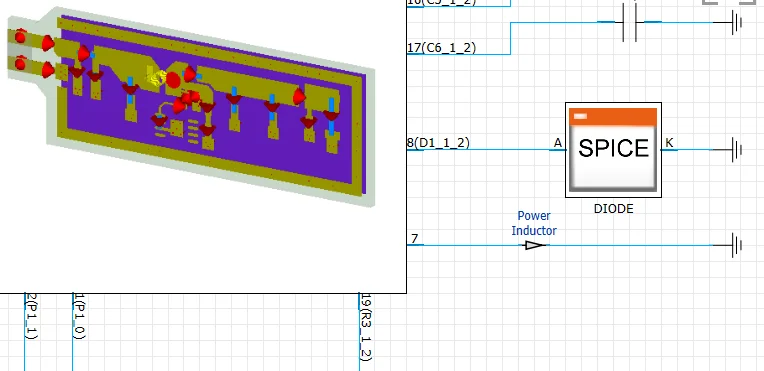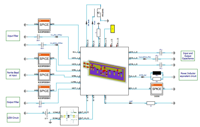 After that, the circuit components such as R, L, C, diode and transistor are connected in the schematic with the CST MWS block, which contains the PCB parasitic information. The electric behavior of the passive circuit components can be represented either using a SPICE model or a touchstone model. For the active circuit components, a SPICE model is required. The complete connection of the circuit components and the CST MWS block can be seen in Figure 2.