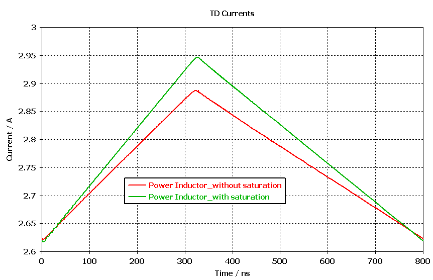 The switching current at the power inductor can be monitored in CST Design Studio using a probe, as shown in Figure 11. The increase of the DC current flowing into the inductor leads to magnetic material saturation, which reduces the relative permeability of the magnetic material from its initial value, thus reducing the inductance value. As the inductance value decreases, a higher current ripple at the inductor can also be observed. This can be seen in Figure 12, where the current ripple is compared with the case without saturation.
