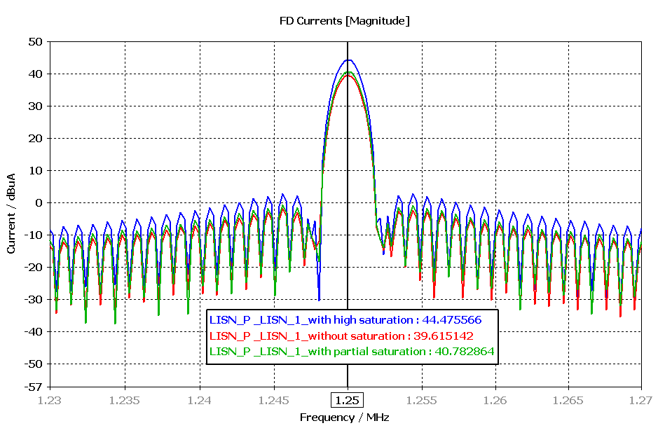 To examine whether the current ripple influences the conducted emission result, we can compare the current spectrum at the Line Impedance Stabilization Network (LISN). This is depicted in Figure 13. We can see that there is only 1 dBmA increment in a partially saturated case (only a 20% reduction of the initial inductance value) and approximately 5dBuA increment for a higher saturation case (for example, 50% reduction of the initial inductance value). This concludes that the saturation effect on the power inductor in this converter example has only a small impact on the conducted emission. Nevertheless, it is important to choose the right inductor with proper current rating to avoid saturation. In addition, it’s important to note that if the saturation effect were considered in the EMI filter components, the impact on EMC performance would become more pronounced.