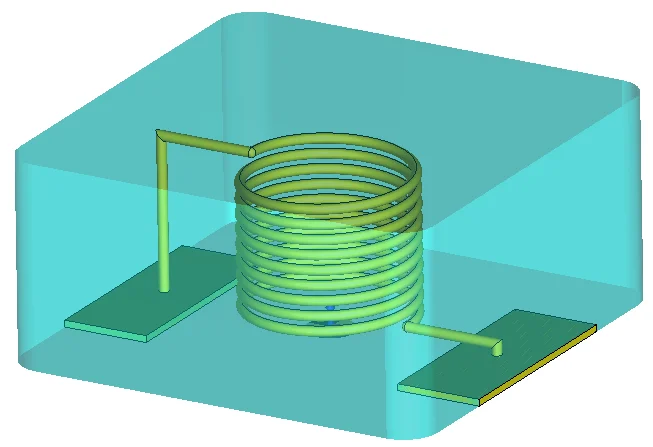 As mentioned earlier, to accurately model the field radiation of the power inductor in the simulation, the 3D model of the coil must be considered. The material of the inductor body is modeled using the Debye 1st-order magnetic dispersion model with a static permeability of 125. Figure 3 shows the 3D model of the power inductor inside CST MWS. After that, it is placed on the PCB using the import subproject feature as shown in Figure 4 and then simulated.