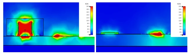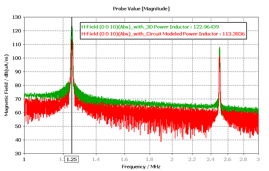 Similarly, we can also observe the magnetic field strength differences using the near-field probe. In contrast to the near-field monitor, the near-field probe provides a wideband result. The probe is placed 10 mm above the PCB. Figure 6 shows an H-field comparison between the 3D inductor model and the circuit-modeled power inductor.
