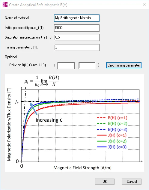 The initial permeability, the saturation magnetization and the tuning parameter values are the main material input definitions, and they are automatically created as parameters and listed in the parameter list window. The tuning parameter value controls the slope of the B-H curve in the saturation region and, by default, the value is two. If a known point of the B-H curve is used, the tuning parameter value is automatically calculated based on it.