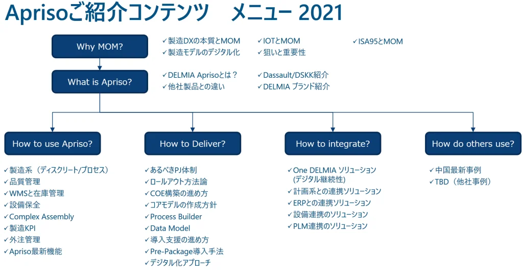 みなさまは、MESという仕組みにどのような印象を持っていますか?私たちのチームでは、DELMIA Aprisoと言うMES製品のコンサルティングや技術支援を行っております。私たちは、このMESを製造業に関わる多くの人に理解いただき、正しく導入していただくことが、日本の工場、そして製造の強化につながると考えております。
