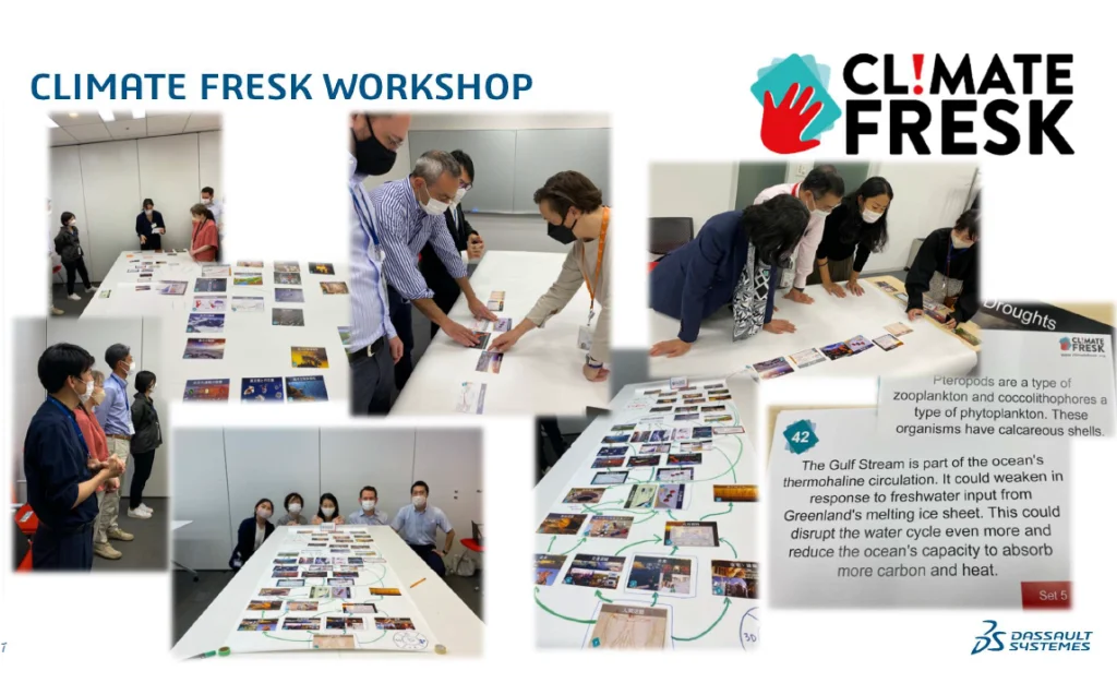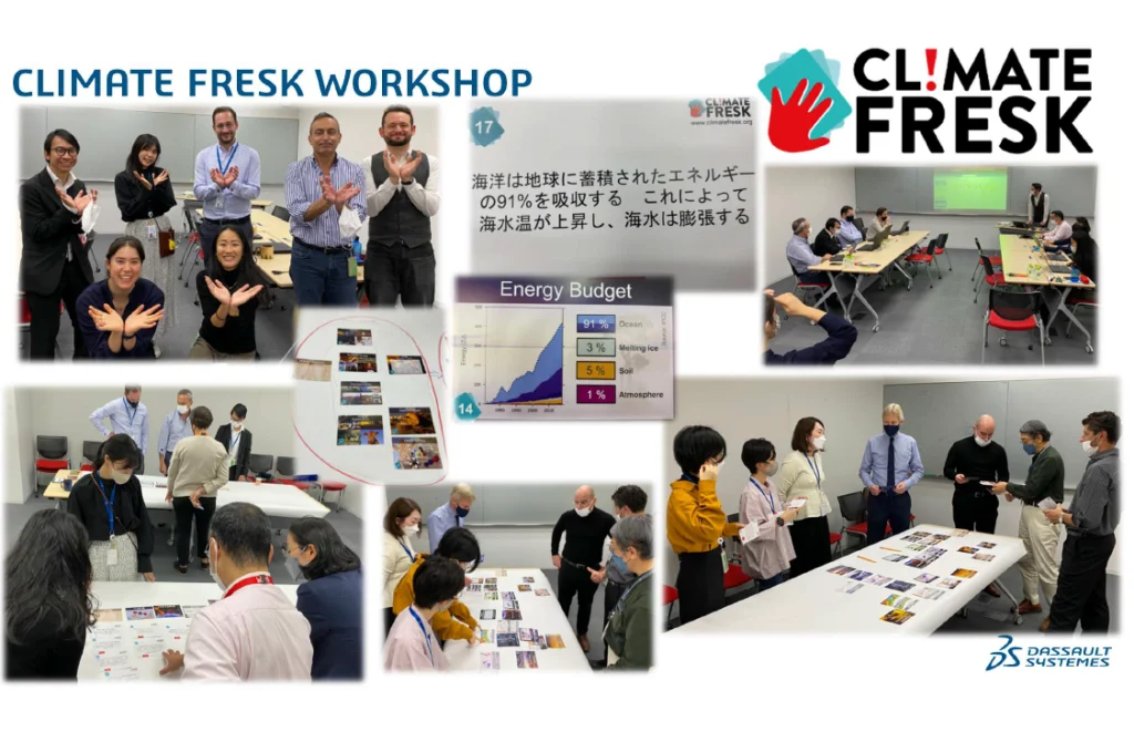「CLIMATE FRESK」は、フランスのNGOであるClimate Freskが提唱し、フランス内外で展開している参加型のワークショップです。ダッソー・システムズは2022年からこのワークショップを社員研修の一つとして取り入れ、世界各国のオフィスで実施しています。日本でも10月と11月で計4回、当社の大崎オフィスと、メディデータ・ソリューションズがある丸の内オフィスで開催されました。私は11月に大崎オフィスで実施されたワークショップに参加してきました。