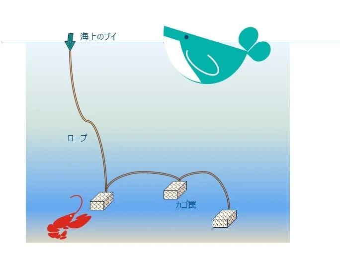 クジラの死傷事故の原因となる漁具には大きく2種類あり、一つは一般的な漁網、もう一つは「ロブスター・トラップ」です。ロブスター・トラップとは、その名前の通りロブスターを捕る目的で海底に設置されるカゴ罠で、いくつものカゴをロープで結んだ仕掛けをつくり、その場所があとからわかるように最後のカゴを海面のブイとつなぎます。つまりロブスター・トラップを仕掛けると、必然的に海面と海上とでロープがはりめぐらされることになります。