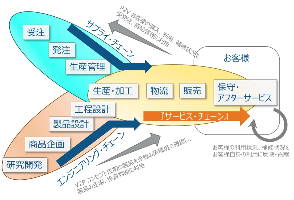 図1の中で、サプライチェーンに貢献するP2Vの例となるのが、レーザースキャナで工場全体をスキャンするケースです。生産・加工の物理の状況をサプライチェーンの上流の仮想環境に再現しています。またエンジニアリング・チェーンの上で、実際の製品を物理で作成する前に、商品企画や、さらに上流の投資判断に利用しているのがZuri社の事例です。