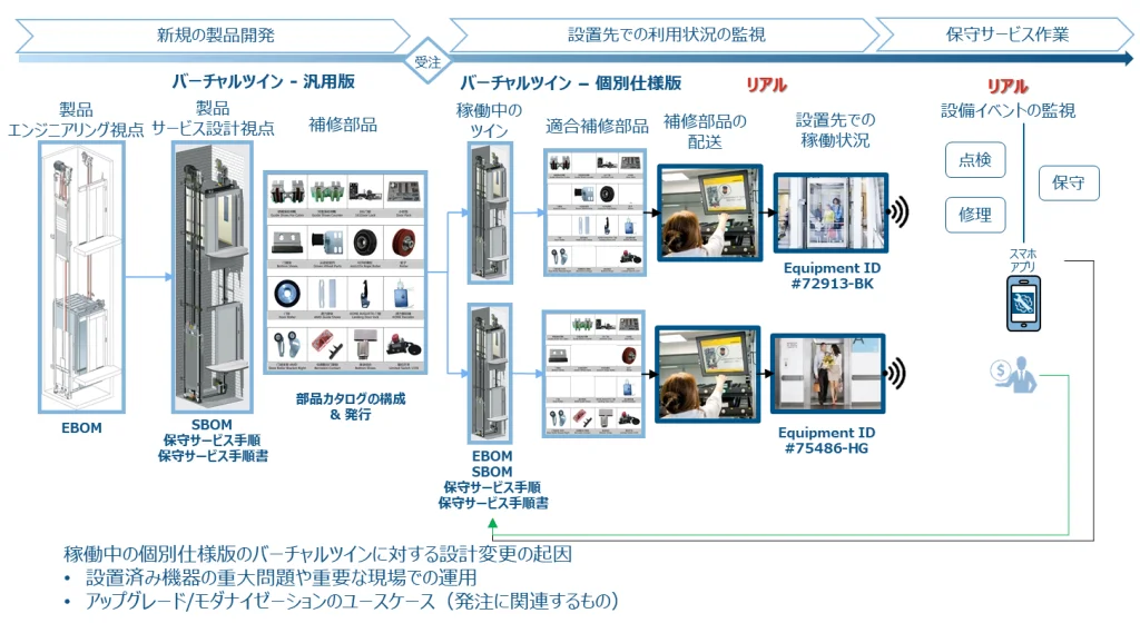 また、自社のお客様先の物理の環境を仮想環境に再現しようとされているビル設備の企業を例にとって活用法を検討してみることもできます。世界各地にあるビルにはそれぞれ固有の特徴があり、ビル設備の企業から見ますと、一つとして同じものはありません。お客様からの要求も厳しく、設備点検や補修時間も最小・最短で完了することが求められます。もちろん設備を開発する際にはこうした要求に応えられるよう設計しますが、お客様の個別の仕様への対応や、納入後の実際の設置先での運用や変更、改善状況は不明となってしまうことが多々あります。