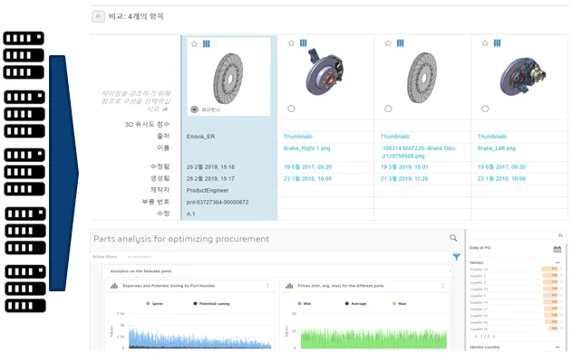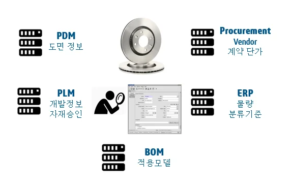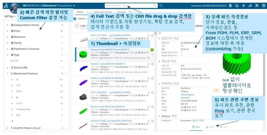 - 3D 설계도와 재질, 중량, 단가, 공정, 수율 및 scrap 비용 등 설계 검토 사항을 한번에 확인 및 비교하여 효율적 의사결정을 지원하는 부품정보 검색 시스템