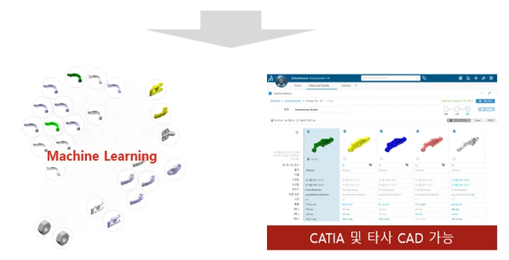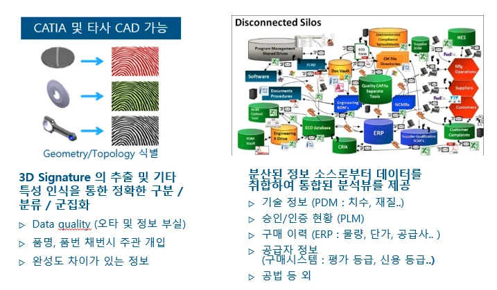 형상비교를 통한 분석 대상 부품의 누락없는 탐색, 부품속성/개발/구매 데이터를 연계 분석하는 서비스 제공 가능.