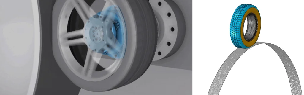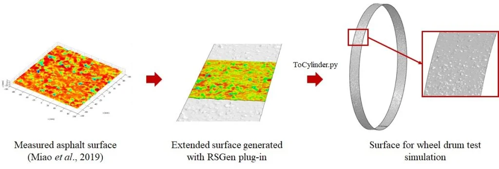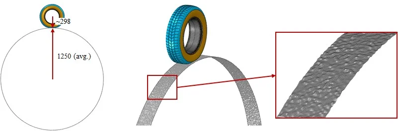 한편 타이어의 동적거동 및 소음은 wheel drum test 를 통해 평가되며 Fig.1 과 같이 원통형의 드럼 위에 타이어를 접촉시킨 후 드럼을 회전시킵니다. Wheel drum test의 유한요소 시뮬레이션은 보통 드럼 표면을 이상적인 매끈한 면으로 가정하나 실제 테스트는 거친 표면에서 발생하는 소음을 측정하기 때문에 시뮬레이션 상에서도 노면 형상을 반영할 필요가 있습니다. 이에 본 포스팅에서는 Abaqus/CAE RSGen plug-in을 활용하여 다양한 노면의 표면조도를 고려한 타이어의 동적거동 분석사례를 소개하겠습니다.