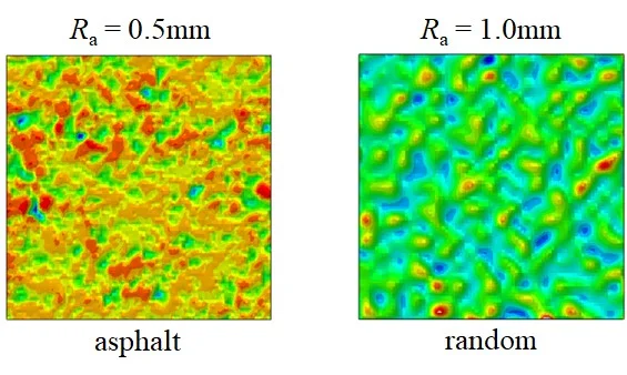 본 포스팅에서는 Miao et al., 2019 논문의 3D laser scanner로 측정한 아스팔트 표면 데이터를 기반으로 Abaqus/CAE RSGen plug-in을 통해 [Link] 강체 3D 쉘요소로 (R3D4) 아스팔트 표면을 구현했습니다. Fig. 2와 같이 200x200mm2 크기의 표면을 주기적으로 반복되는 형태로 확장하였으며 파이썬 스크립트를 통해 원통형태로 변환하였습니다. 표면조도에 따른 타이어 거동 특성을 비교하기 위해 랜덤표면과 아스팔트 표면, 이상적인 표면의 총 세 가지 형태의 드럼을 사용했습니다. Fig. 3에서 아스팔트 및 랜덤표면의 조도를 나타냈습니다.