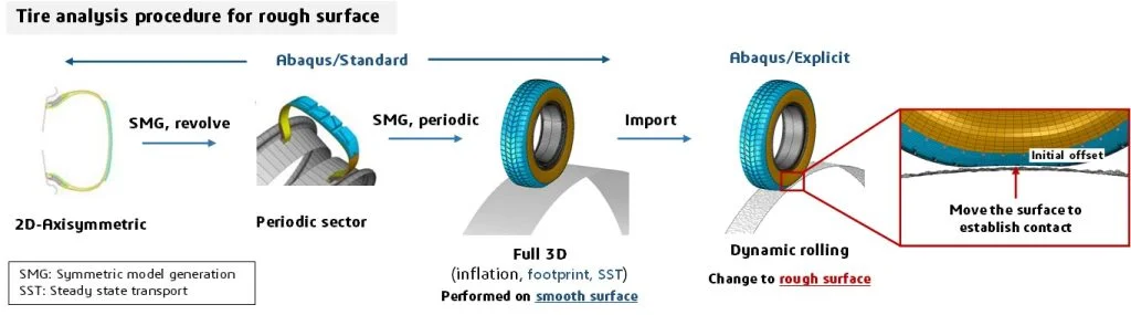 Fig. 4에서 거친표면에서 타이어 롤링해석을 위한 과정을 나타내었습니다. 타이어의 롤링해석을 수행하려면 (1) Full 3D 타이어 구성 (2) 타이어 내압인가 및 노면과 접지 (3) 정상상태 롤링 (4) Explicit 솔버를 활용한 롤링해석의 단계를 거치게 됩니다. Abaqus는 축대칭 모델로부터 Full 3D 타이어를 구성하기 위한 symmetric model generation 기능을 제공하며 steady state transport 프로시저를 통해 정상상태 롤링해석을 Standard 솔버로 수행할 수 있습니다. 또한 Standard 솔버로 도출한 정상상태의 타이어를 Import 기능을 활용해 Explicit 해석의 초기상태로 적용할 수 있습니다.
