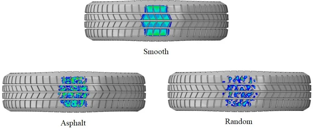 Fig. 6에 세 종류의 표면에 따른 접촉압력 분포를 (CPRESS) 나타내었습니다. 표면조도가 가장 큰 랜덤표면의 경우 접지면적이 가장 작으며 아스팔트, 이상적인 표면의 순으로 더 넓은 면에 걸쳐 접촉이 발생하는 것을 확인할 수 있습니다. 또한 표면조도가 클수록 접촉압력이 균등한 분포에서 집중된 형태로 변하는 것을 볼 수 있습니다.