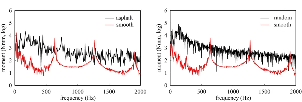 Fig. 7에는 드럼 중심에서 측정한 반력 모멘트의 FFT plot을 나타내었습니다. 모멘트는 타이어의 거동이 안정된 시점인 5~6번째 회전 사이클의 결과를 사용했습니다. 이상적인 표면의 (smooth) 경우 특정 주파수에서 우세한 피크가 나타나는 것을 볼 수 있는데 이는 타이어 패턴형상의 주기성으로 인해 발생한 주파수와 하모닉 성분들입니다.