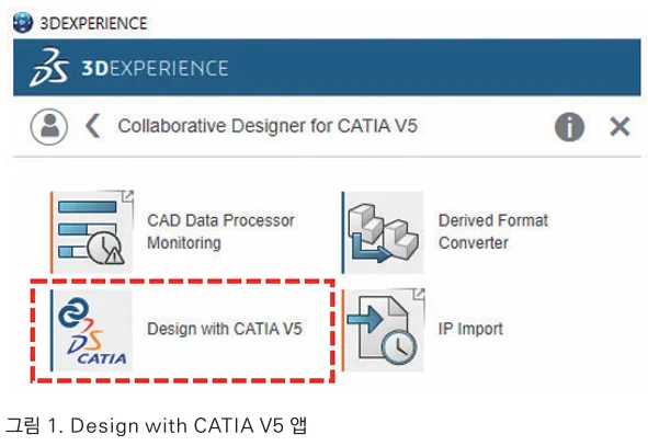 3D익스피리언스 플랫폼의 앱 중 ‘Design with CATIA V5’앱을 사용하여 카티아 V5를 자동으로 실행한다.