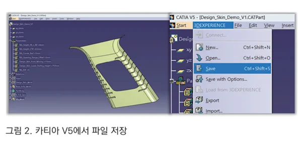 자동으로 실행된 카티아 V5의 메뉴를 자세히 살펴보면 ‘3DEXPERIENCE’ 메뉴가 생성된 것을 확인할 수 있다. 카티아 V5에서 작업할 B-필러 어퍼 트림 모델을 불러온 후에 3D익스피리언스에 저장하면 3D익스피리언스에서 모델이 연계된다.