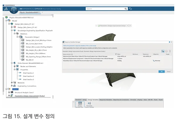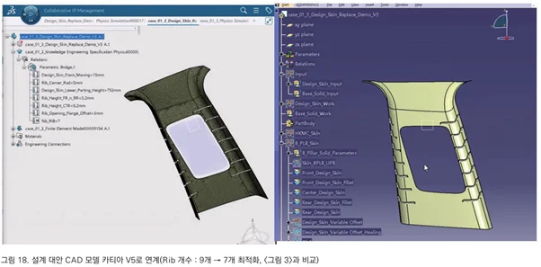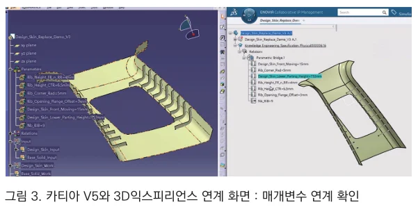 3D익스피리언스에서 ‘Parametric Bridge'(설계 프로그램에서 생성한 매개변수를 3D익스피리언스에 연계해서 그대로 사용할 수 있는 기능)를 사용해 카티아 V5에서 설정한 매개변수를 3D익스피리언스와 연동한다. 해당 매개변수 중 일부는 추후에 설계 탐색에 활용할 수 있다.