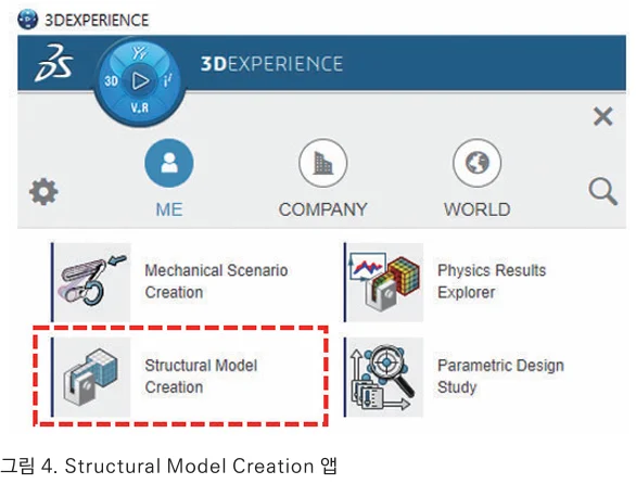구조해석용 모델을 만들기 위해 3D익스피리언스에서 ‘Structural Model Creation’ 앱을 실행한다. 이 앱에서는 해석 모델을 만들기 위한 전처리 작업을 수행한다.