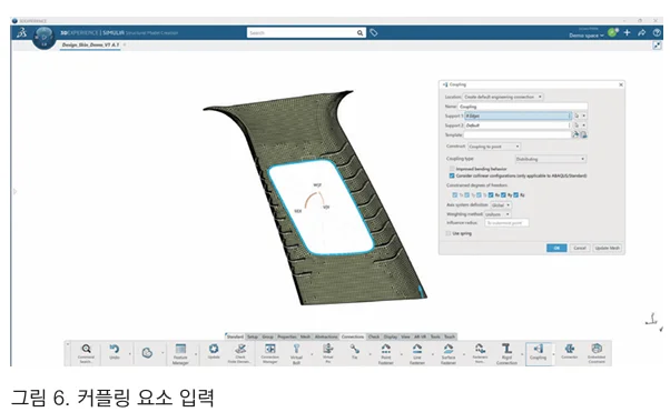 구조해석을 위한 메시를 생성한다. 이번 호에서는 간단하게 셸 쿼드 메시(shell quad mesh)를 생성했다. 3D익스피리언스에서는 빔(beam), 셸(shell), 솔리드(solid) 메시를 제공하며 지오메트리(geometry) 기반으로 메시 사이즈를 자동으로 선택해주는 기능도 제공한다. 또한 표준화된 규칙(rule)을 만들어서 메시를 생성할 수 있기 때문에, 설계 엔지니어도 쉽게 사용할 수 있다.