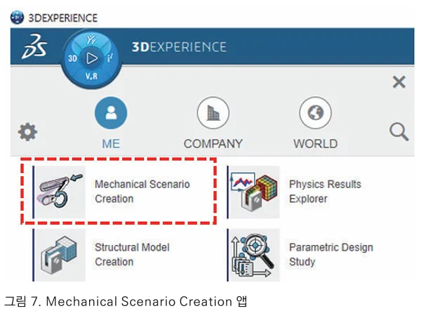 구조해석을 수행하기 위해 3D익스피리언스에서 ‘Mechanical Scenario Creation’ 앱을 실행한다. 이 앱에서는 앞서 만든 해 석 모델을 불러와서 해석 절차, 경계조건, 하중 등을 입력한 후에 해석을 수행한다.