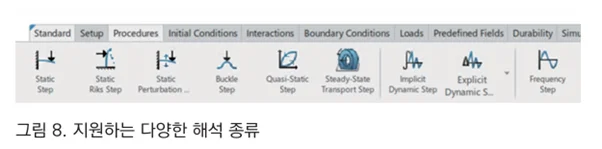 첫 번째로, 간단한 정적 해석을 위한 해석 절차를 생성한다. 3D익스피리언스에서는 구조해석 소프트웨어인 아바쿠스(Abaqus) 솔버를 사용하므로 아바쿠스에서 구조해석을 수행하는 것과 마찬가지로 Static, frequency, Explicit 해석 절차를 동일하게 선택할 수 있다.