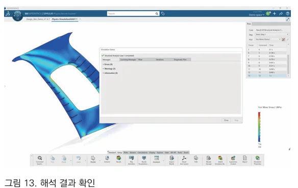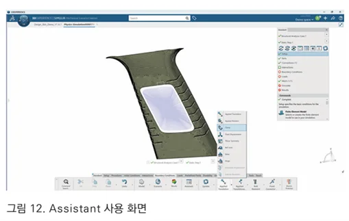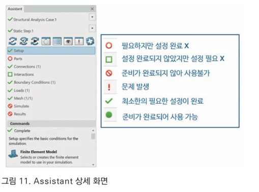 마지막으로, 3D익스피리언스에서 선택한 해석 종류에 맞춰서 해석에 필요한 구성요소들이 잘 설정되어 있는지를 확인할 수 있는 어시스턴트(Assistant)를 확인해보고, 문제가 없으면 해석을 실행한다. 직관적으로 필요한 요소들을 잘 식별해주기 때문에, 구조해석을 처음 수행하는 설계 엔지니어도 부담 없이 쉽게 따라할 수 있다.