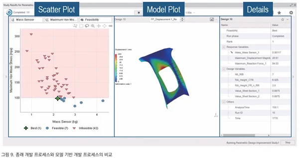 샘플링 포인트(sampling point)가 생성될 때마다 실시간으로 결과를 확인할 수 있으며, 설계 변수와 응답 변수를 원하는 X, Y 축에 맞춰 비교할 수도 있다. 스터디 완료 후에는 필터링 기능을 사용하여 원하는 설계안만 추려서 비교할 수 있다. Scatter Plot에서 제한조건을 충족하지 못하는 설계안이 ‘Infeasible’로 표시되고, 조건을 만족하는 설계안은 ‘Feasible’로 표시된다. 그 중에서도 목표에 가장 근접한 설계안은 ‘Best’로 표시된다. 또한, Model Plot에서는 각 설계안의 결과 변수를 즉시 컨투어(contour) 형태로 시각화해 확인할 수 있으며, 상세한 결과는 왼쪽 패널에서 세부적으로 확인할 수 있다. 이를 통해 설계 엔지니어는 해석 결과를 직관적으로 분석하고, 설계 최적화 과정을 효 율적으로 진행할 수 있다.